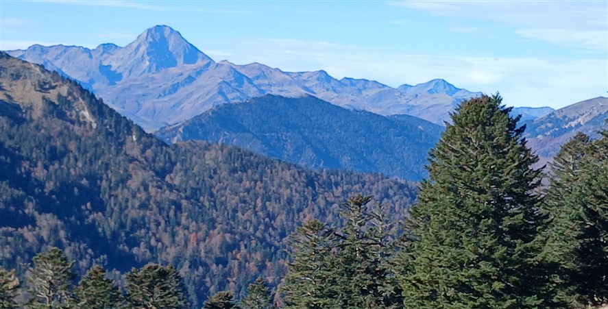 paysage défile, grandiose, avec au loin les montagnes de Balès et le pic